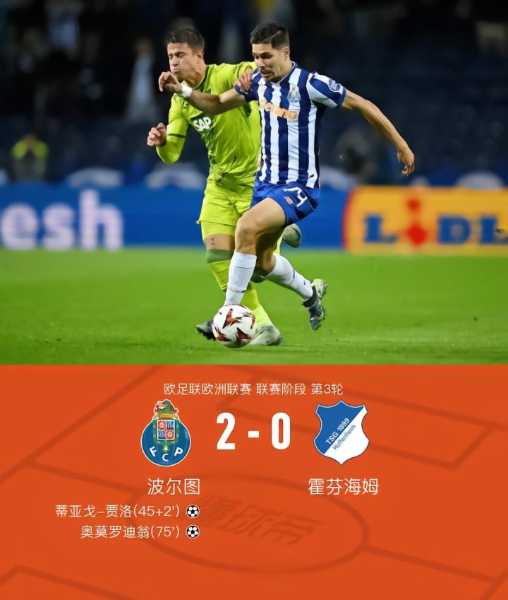 波尔图2-0霍芬海姆,贾洛破门,奥莫罗迪翁锁定胜局