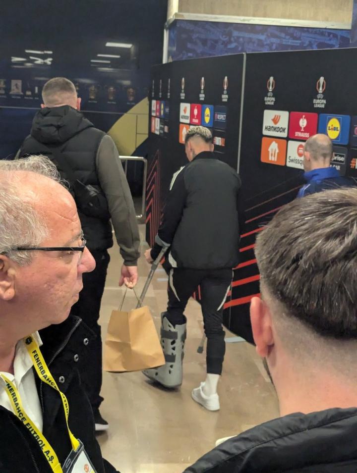 在与费内巴切的比赛中受伤后, 曼联前锋安东尼被拍到拄着拐离开球场。