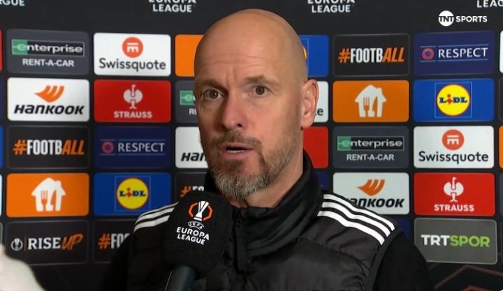 欧联杯赛场,在率队1-1客场打平费内巴切赛后,曼联主帅滕哈格接受了TNT Sports的采访。