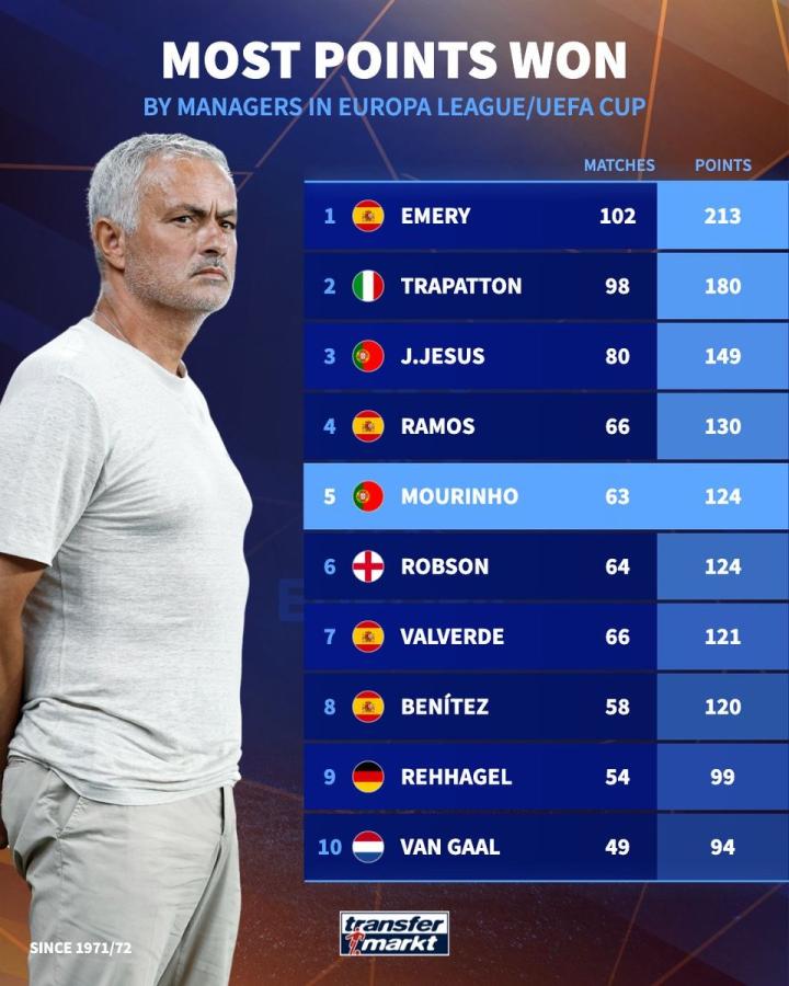 在率领费内巴切1-1战平曼联后,穆里尼奥执教生涯已在欧联杯拿到124分,追平了恩师博比-罗布森爵士,位列历史第五。