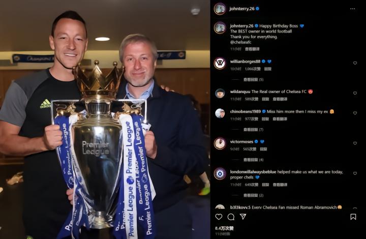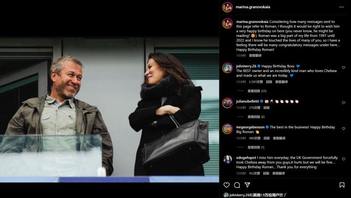 切尔西名宿、传奇队长约翰-特里和前切尔西总监玛丽娜-格拉诺夫斯卡娅在社媒晒图,祝前切尔西老板阿布拉莫维奇58岁生日快乐。