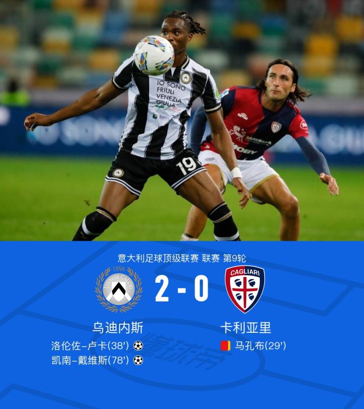 乌迪内斯2-0十人卡利亚里,马孔布染红,卢卡、戴维斯建功