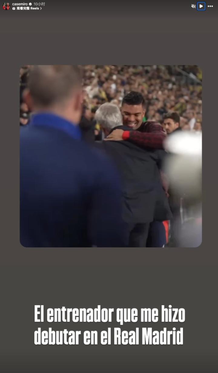 卡塞米罗在社交媒体晒出视频,并写道:“让我在皇家马德里完成首秀的教练。”