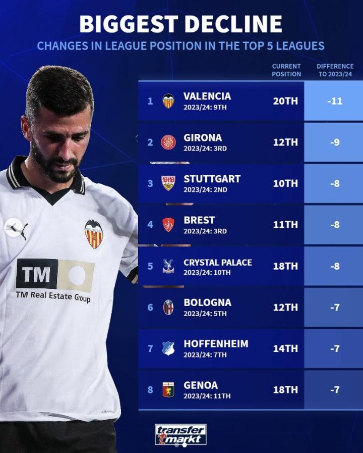 最近,德国转会市场列出了本赛季五大联赛球队与上赛季相比的排名下降情况。目前,瓦伦西亚在西甲联赛垫底,下降了11名。赫罗纳下降了9名。