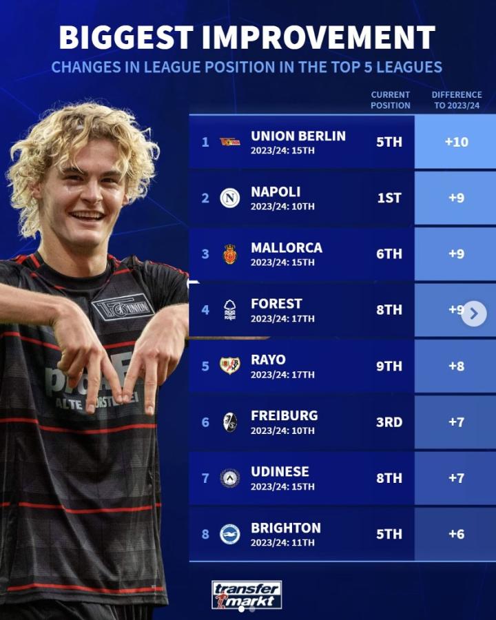 最近,德国转会市场列出了本赛季五大联赛球队与上赛季相比的排名提升情况。目前,柏林联合提升10名,那不勒斯提升9名,布莱顿提升了6名。