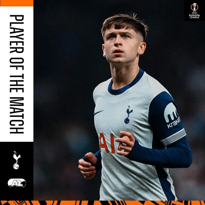 热刺官方消息,17岁小将米凯伊-穆尔当选vs阿尔克马尔队内最佳球员。
