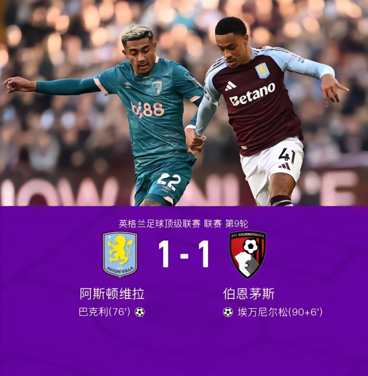 维拉1-1遭伯恩茅斯绝平,巴克利破门