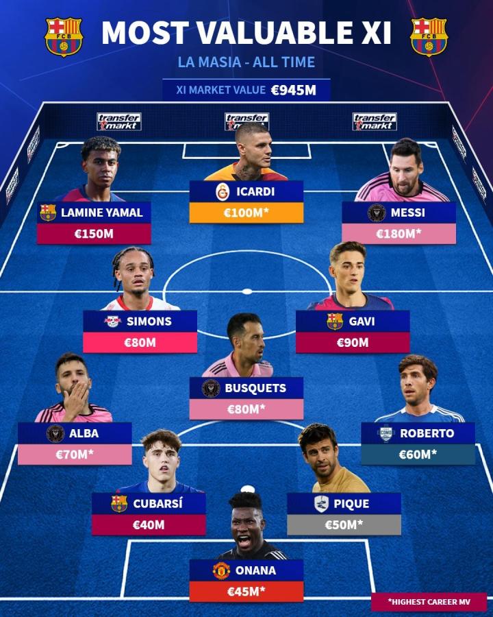 德国转会市场网站列出了拉玛西亚球员历史最贵阵容,梅西领衔,亚马尔、伊卡尔迪、奥纳纳等人在列。