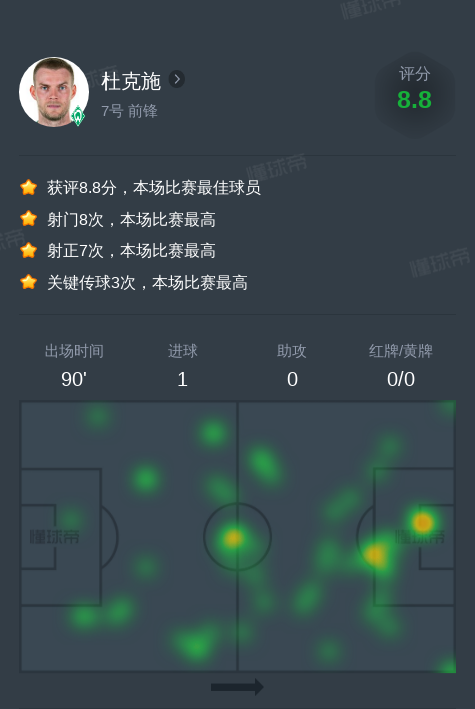 北京时间10月27日云达不莱梅vs勒沃库森,杜克施贡献1球,3次关键传球,8次射门。