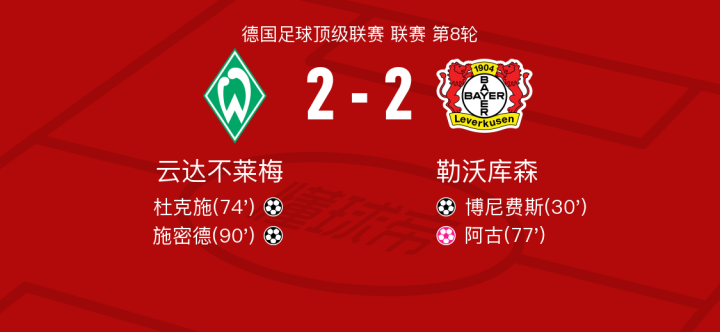 北京时间10月27日云达不莱梅vs勒沃库森,杜克施得到全场最高的8.8分,格吕尔得到全场最低的6.3分
