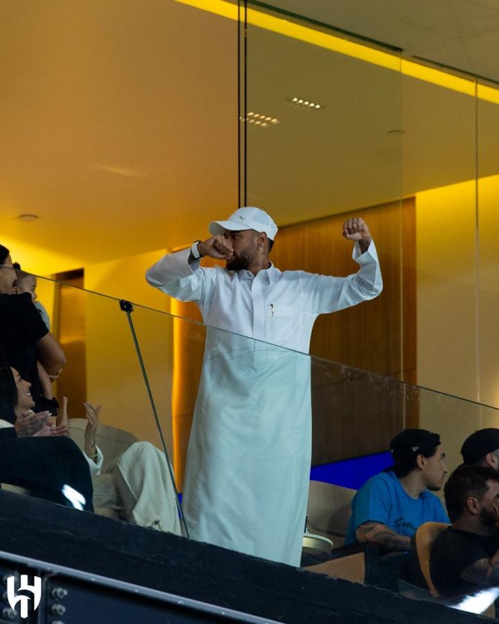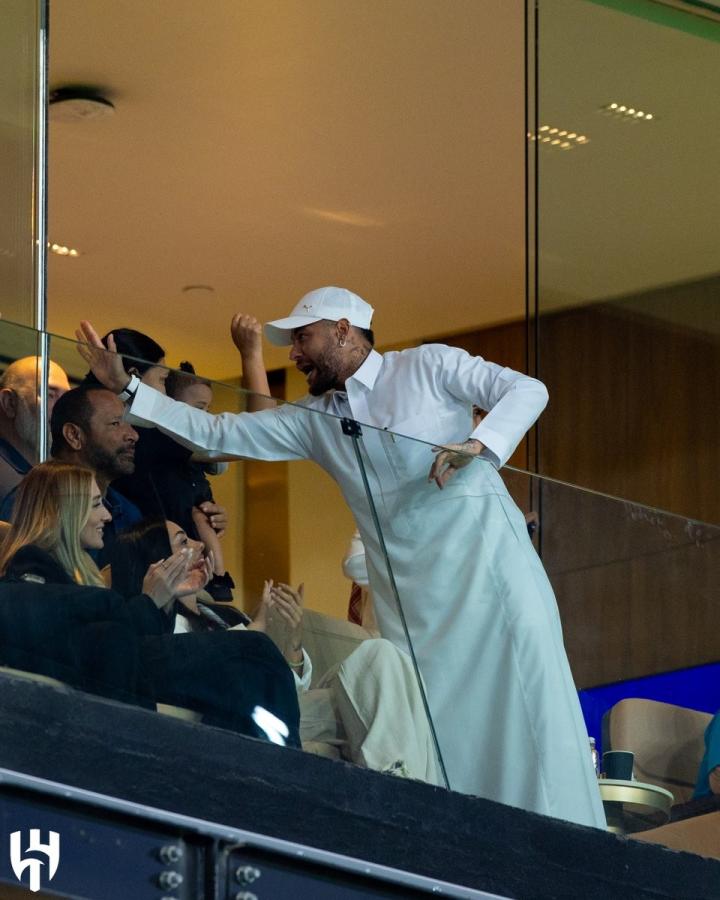 沙特联赛第8轮,利雅得新月主场对阵布赖代合作,因在联赛中没被注册而无法出场的内马尔在包厢支持球队。