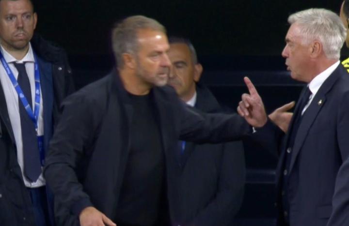 在四球落后的情况下,安切洛蒂在场边与弗里克进行了对话。