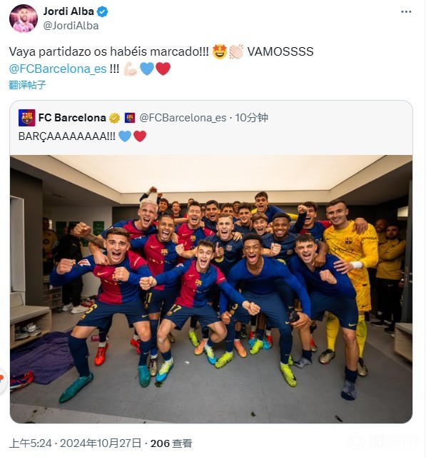 阿尔巴转发了巴萨官方发布的全队合照,并配文:“你们踢了一场精彩绝伦的比赛!!!加油!!!”
