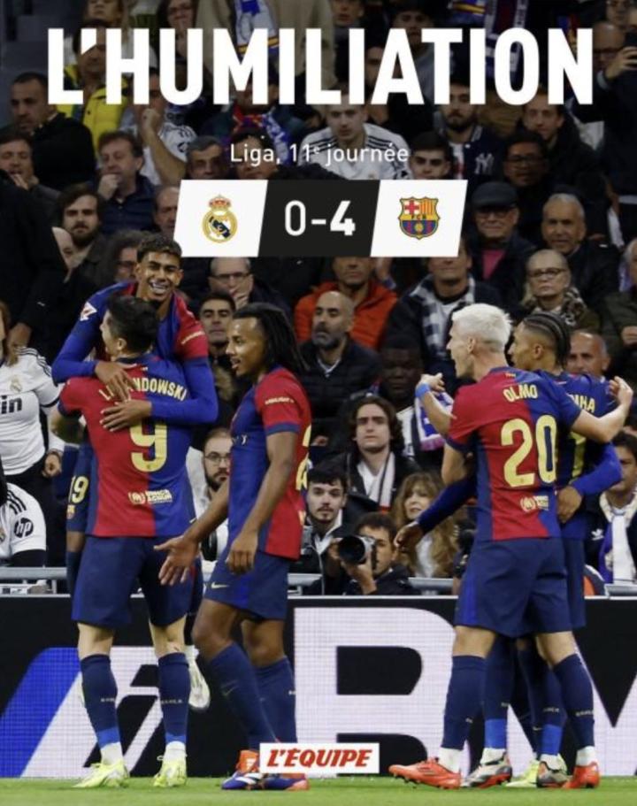 皇家马德里在主场以0-4的比分输给了巴塞罗那,法国媒体《队报》直接以“耻辱”作为了今日头版封面的标题。