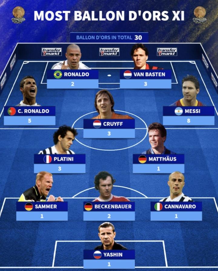 北京时间10月27日,德国转会市场列出了一套获得金球奖次数最多的阵容,梅西、C罗领衔,普拉蒂尼、克鲁伊夫等人在列。