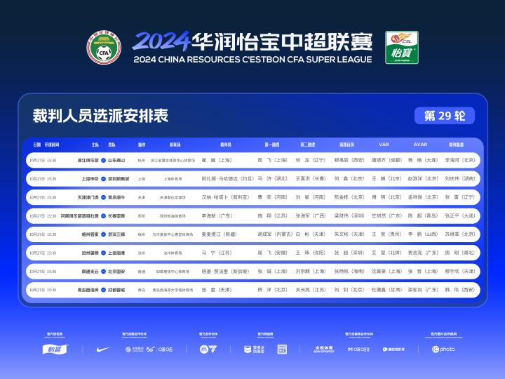 10月27日,中国足协官方公布了中超联赛第29轮裁判员选派名单,阿扎姆-马哈德迈、汉纳-哈塔卜、塔基-贾法里三位外籍裁判分别执法申花vs新鹏城、津门虎vs海牛和南通vs国安的比赛,马宁执法沧州vs海港。