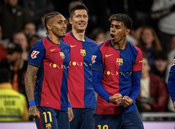 西班牙国家德比,巴塞罗那4-0击败皇家马德里,球队三叉戟莱万多夫斯基、亚马尔和拉菲尼亚包办了球队的全部进球。