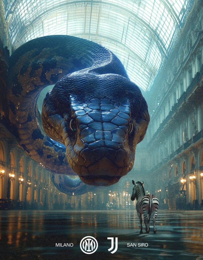 在本场比赛的预热海报中,国际米兰采用了俱乐部的吉祥物“蛇精灵”来代表自己,用一头斑马来代表尤文,双方在一个教堂中间相遇。