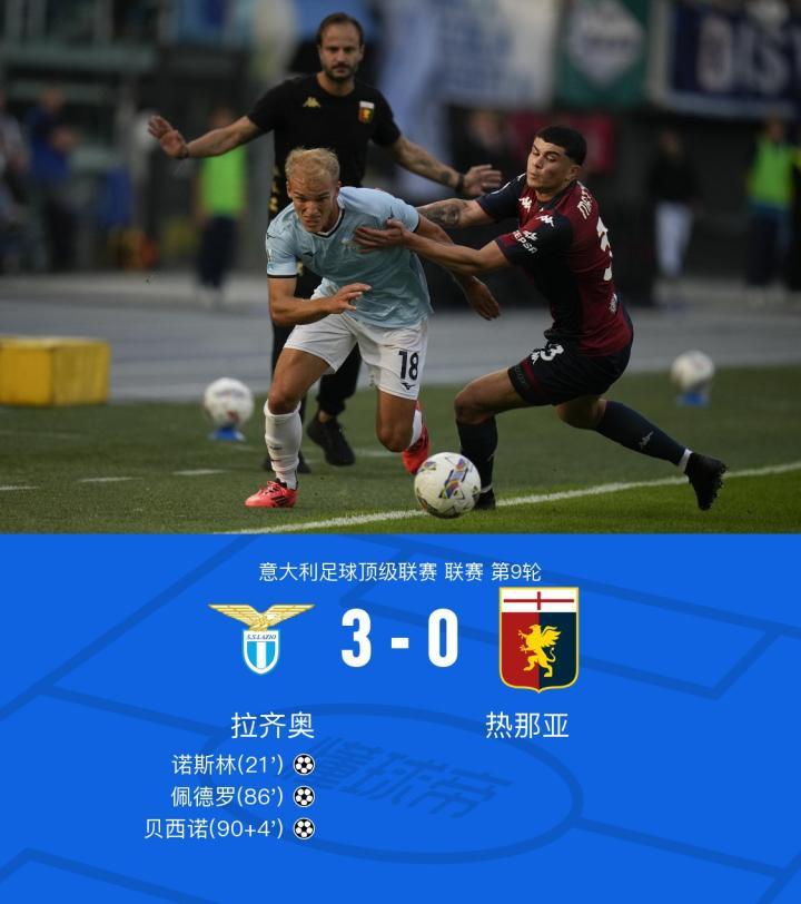 拉齐奥3-0热那亚,诺斯林、贝西诺、佩德罗破门