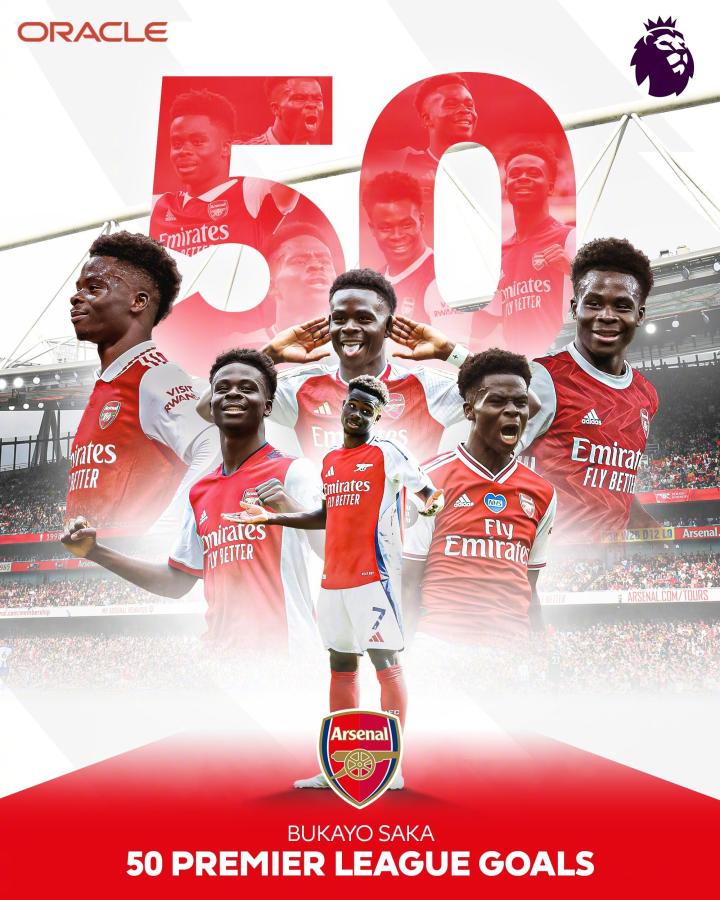 这个进球使得萨卡迎来了属于他个人的里程碑,截至目前他已经在英超联赛中取得了整整50个进球,他在自己的第六个英超赛季中实现了这一点。
