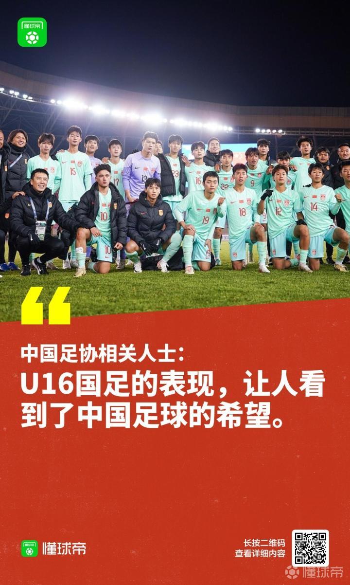 U17男足亚洲杯预选赛C组最后一轮角逐,中国队2-2战平韩国队,以5支成绩最好的小组第2名身份晋级。《北京青年报》记者@肖赧 报道,中国足协相关人士在看完比赛后直言:“U16国足的表现,让人看到了中国足球的希望。”