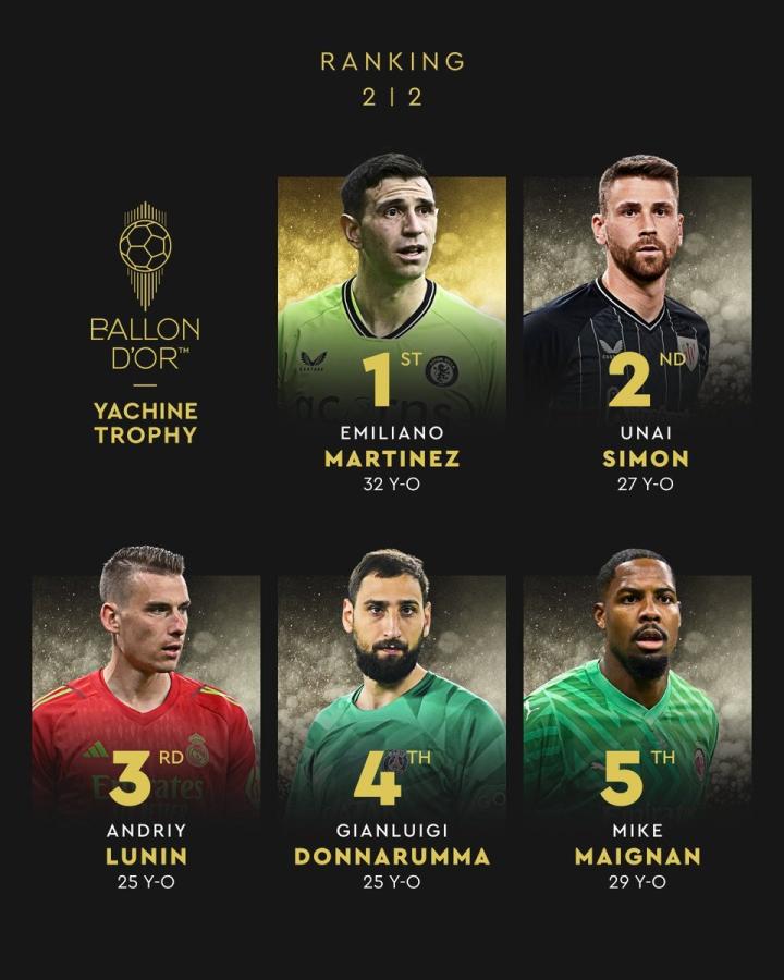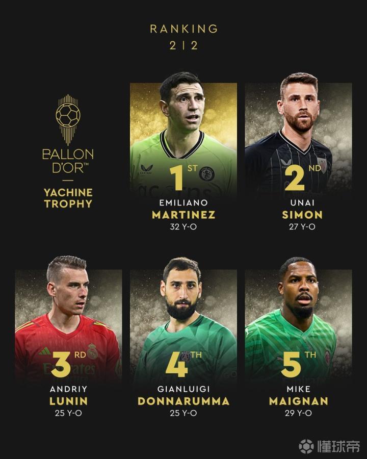 2024年雅辛奖排名揭晓,达米安-马丁内斯第一,乌奈-西蒙第二,卢宁第三。