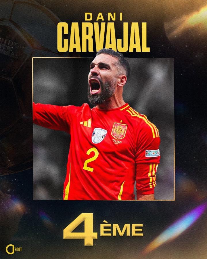 在2024金球奖的评选中,皇家马德里的右后卫卡瓦哈尔最终位列第4位。