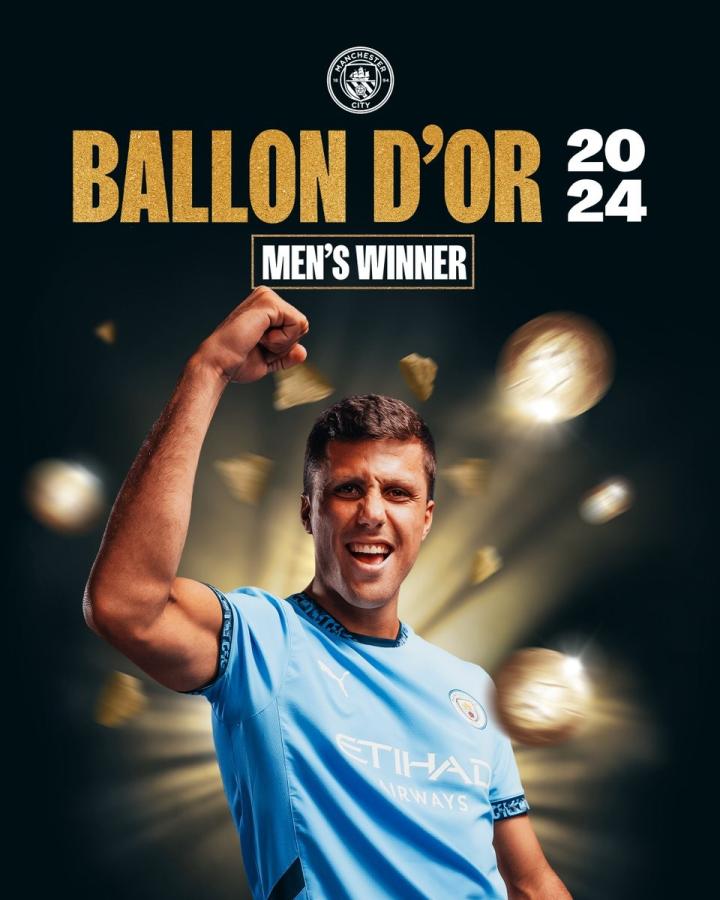 曼城官方发布海报为队史第一人送上祝贺,写道:“Rodriiiiiiiiiii 🩵2024年男足金球奖得主。”