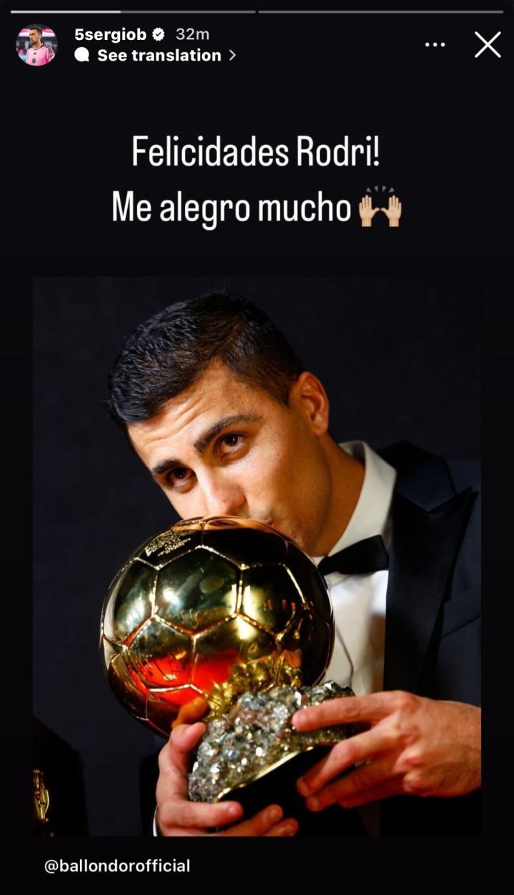 在罗德里获得金球奖后,布斯克茨在社交媒体上发文写道:“祝贺罗德里!我太高兴了。”