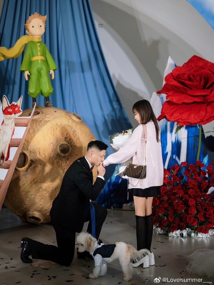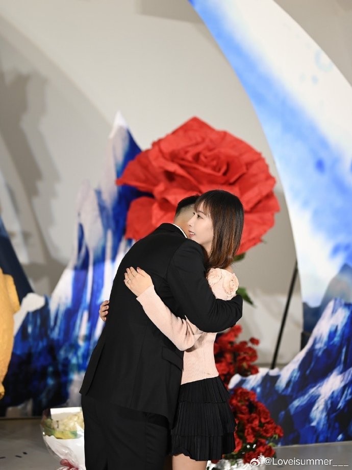 在精心布置的浪漫场地,方昊单膝跪地,为女友戴上钻戒,两人相拥、亲吻。