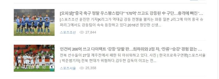 10月29日,韩国门户网站naver最热门的两条国内足球新闻分别是韩国媒体嘲讽南通支云降级与全北现代K联赛顶薪仍陷降级区。
