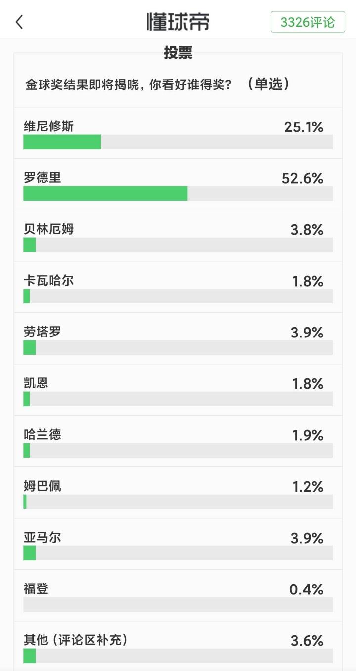 而在昨天14点发起的 球迷态度:金球奖结果即将揭晓,你看好谁得奖?的投票中,共有102725位我懂用户参与,其中52.6%选择了最终获奖的罗德里。