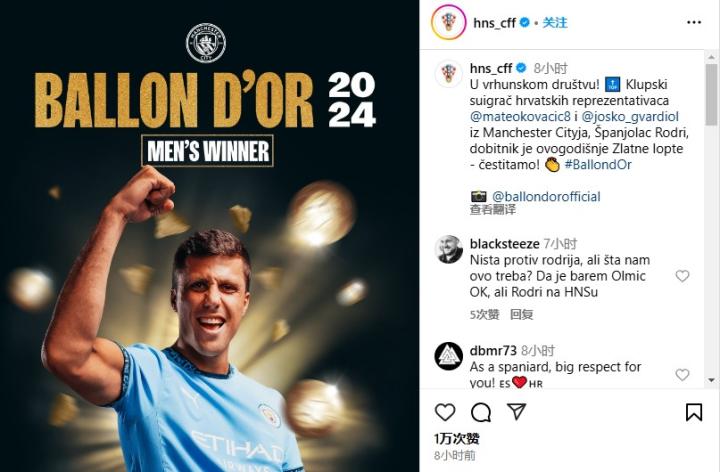 克罗地亚官方晒出了罗德里赢得金球奖的海报,并配文:来自顶级俱乐部!来自曼城的西班牙球员罗德里获得了今年的金球奖,他是克罗地亚国家队成员科瓦契奇和格瓦尔迪奥尔的队友,祝贺他!”