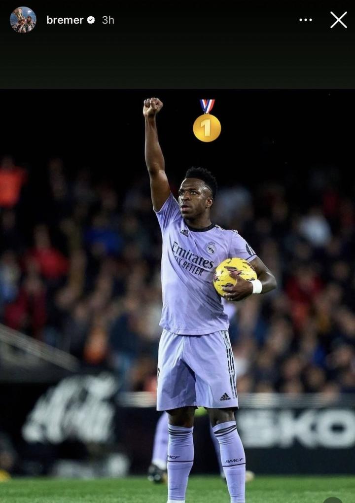 尤文图斯的巴西后卫布雷默在社交媒体晒出一张维尼修斯的照片,并配上第一名金牌🏅的表情。