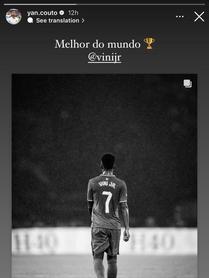 扬-科托在社交媒体上晒出了维尼修斯的照片,并配文写道:“世界最佳。”