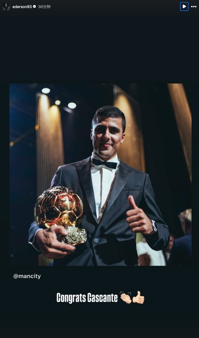 在罗德里获得2024年金球奖后,曼城的巴西门将埃德森在社交媒体送上祝贺。