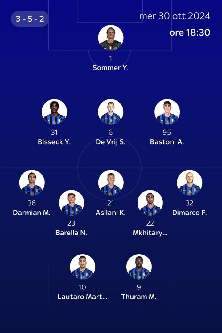 索默;比塞克、德弗赖、巴斯托尼;达米安、巴雷拉、阿斯拉尼、姆希塔良、迪马尔科;劳塔罗、马库斯-图拉姆