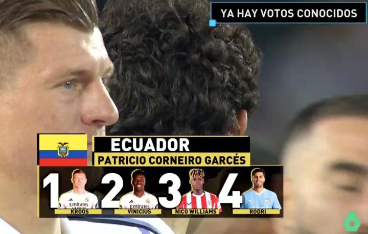 根据报道,厄瓜多尔记者Patricio Corneiro Garces的金球奖投票顺序为:克罗斯第一、维尼修斯第二、尼科-威廉斯第三、罗德里第四。