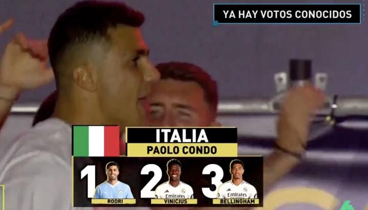西班牙六台透露了意大利记者的金球奖投票顺序,罗德里第一、维尼修斯第二、贝林厄姆第三。