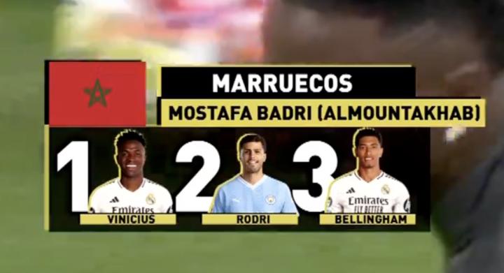 根据报道,摩洛哥记者Mostafa Badri的金球奖投票顺序为:维尼修斯第一、罗德里第二、贝林厄姆第三。