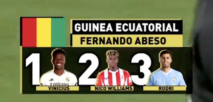 根据报道,几内亚记者Fernando Abeso的金球奖投票顺序为:维尼修斯第一、尼科-威廉斯第二、罗德里第三。