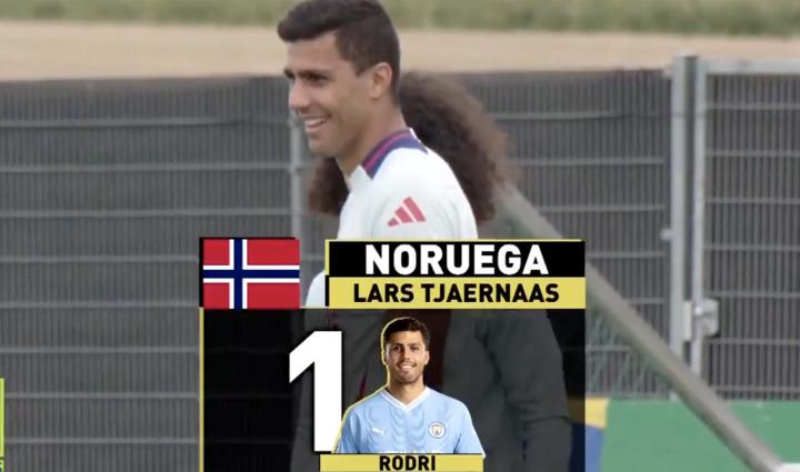 根据报道,挪威记者Lars Tjaernaas的金球奖投票第一位给了罗德里。