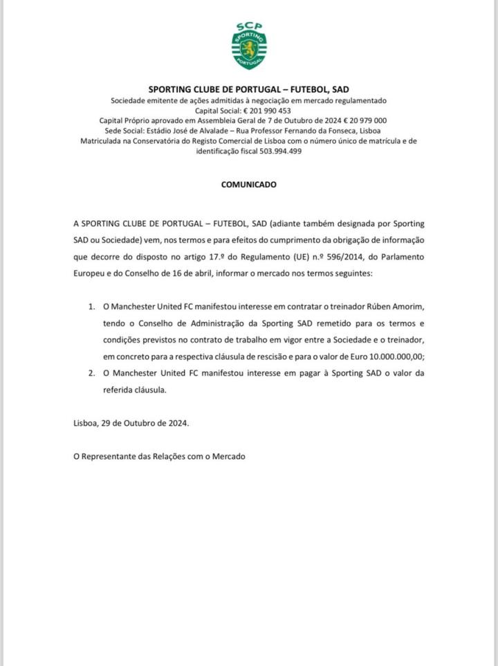 葡萄牙体育俱乐部向葡萄牙证券交易所发布声明称,曼联表达了聘请主教练鲁本-阿莫里姆的意向,俱乐部已经将相关条款和条件告知曼联,尤其是1000万欧的解约条款。