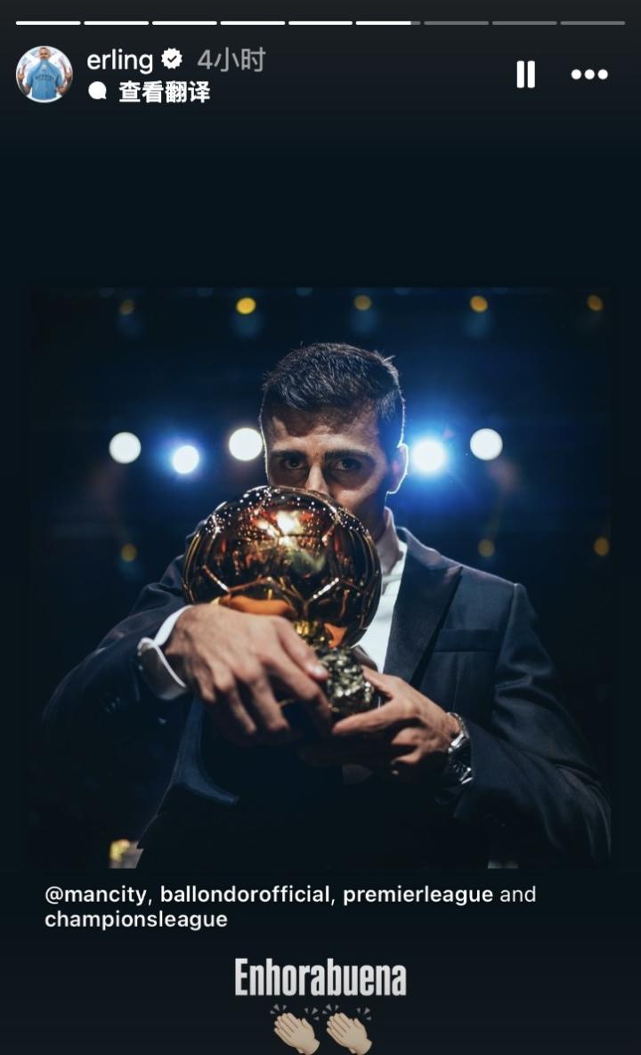 哈兰德在社交媒体上晒出了罗德里赢得金球奖的照片,并配文写道:“祝贺👏👏。”