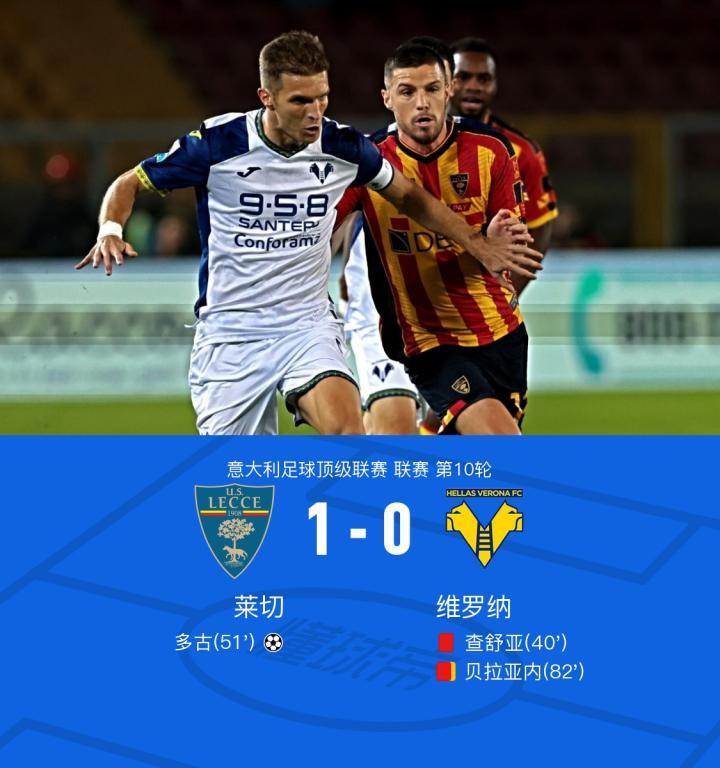 莱切1-0九人维罗纳,多古一击制胜,查舒亚、贝拉亚内染红