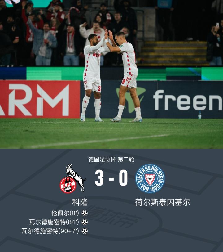 德国杯科隆3-0基尔晋级,瓦尔德施密特梅开二度,伦佩尔破门