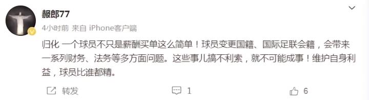 记者肖赧在微博里写道:“归化一个球员不只是薪酬买单这么简单!球员变更国籍、国际足联会籍,会带来一系列财务、法务等多方面问题。这些事儿搞不利索,就不可能成事!维护自身利益,球员比谁都精。”