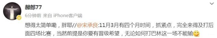 另外,对于塞尔吉尼奥入籍归化,澎湃新闻记者宋承良认为:“今年11月到明年3月有四个月时间,抓紧点,完全来得及打后面四场(国足18强赛)比赛。当然前提是你要有晋级希望,无论如何打巴林队这一场不能输。”随后,记者肖赧回复说:“想得太简单嘞。”