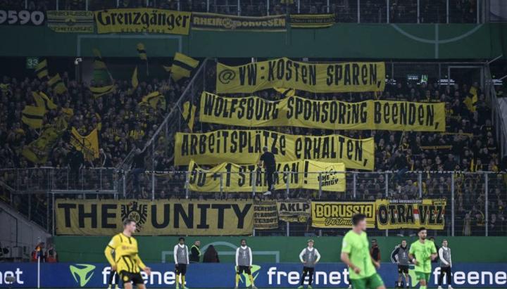 北京时间10月30日,德国杯第二轮,沃尔夫斯堡1-0战胜多特蒙德。比赛中,多特球迷举起了针对沃尔夫斯堡主要赞助商的大众汽车的横幅。