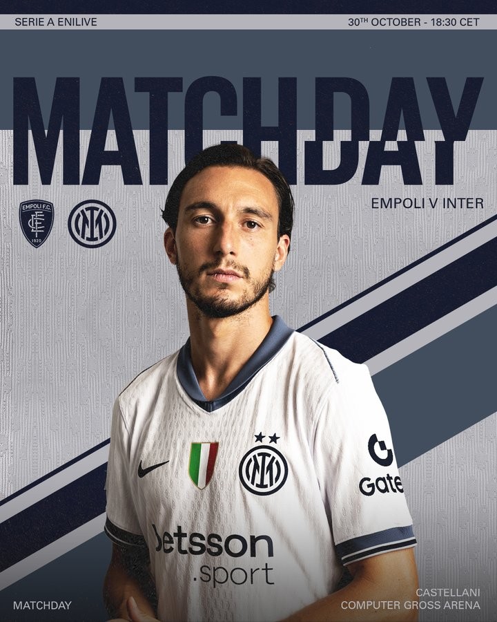 北京时间10月30日,国米发布联赛客战恩波利的赛前海报,后卫达米安单人出镜。
